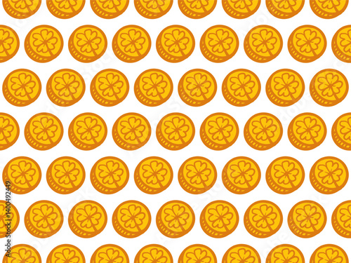 Repeating Seamless pattern of golden coins with four-leaf clovers, perfect for St. Patrick’s Day decor, festive packaging, digital backgrounds, and textile designs.