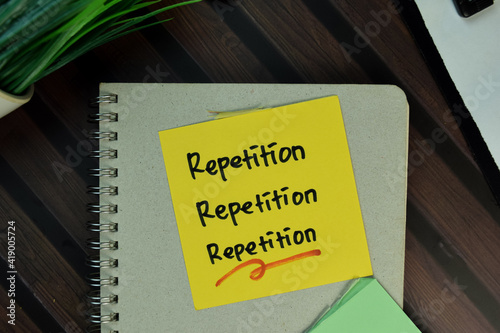 Repetition, Repetition, Repetition write on sticky notes isolated on Wooden Table.