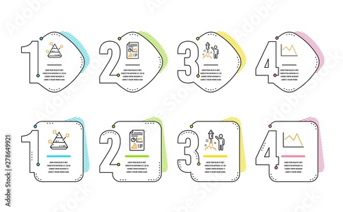 Report document, Pyramid chart and Fireworks icons simple set. Line chart sign. Report analysis, Party pyrotechnic, Financial graph. Science set. Infographic timeline. Line report document icon