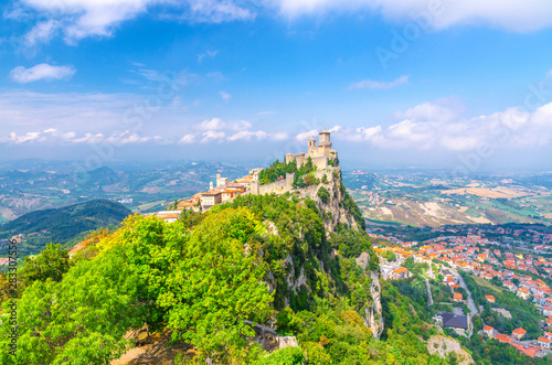 Republic San Marino Prima Torre Guaita first fortress tower with brick walls on Mount Titano stone rock with green trees, aerial top panoramic view of landscape valley and hills of suburban district