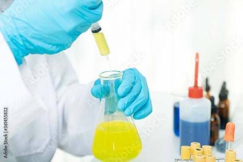 Researcher or scientists loads liquid sample into beaker in laboratory. Researchers are developing vaccines and medicine to treat the COVID-19 virus.