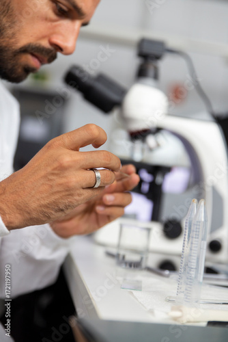 Researcher preparing microscope slide in laboratory with equipment