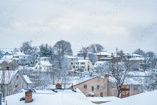 Residential neighborhood covered in snow.
