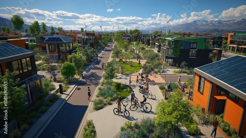 Residential street with families cycling and walking among dense urban greenery for outdoor lifestyle.