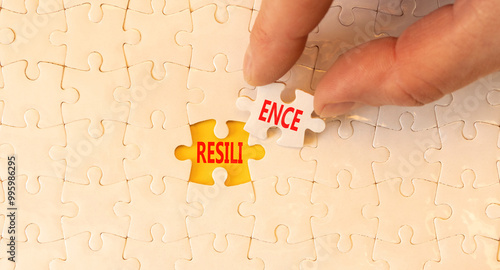 Resilience symbol. Concept word Resilience on beautiful white puzzles. Beautiful yellow background. Businessman hand. Business resilience concept. Copy space.