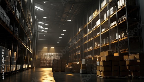 Retail warehouse full of shelves with goods in cartons, with pallets and forklifts. Logistics and transportation blurred background. Product distribution center. Warehouse concept. Delivery concept