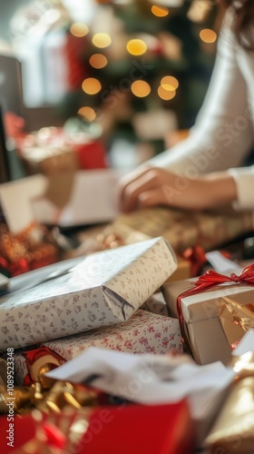 Retiree sorts belongings amid gifts, cards, and decorations in a festive atmosphere