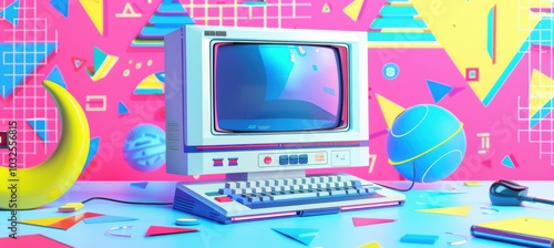 Retro 90s Tech Advertisement with Vintage Desktop Computer and Vibrant Neon Geometric Background