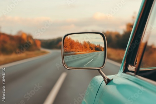 Retro car side mirror reflecting autumn landscape during a tranquil drive on an open road