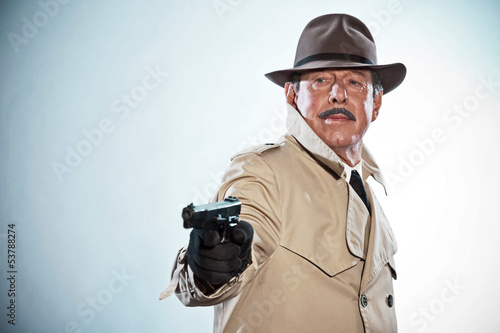 Retro detective with mustache and hat. Holding gun. Studio shot.
