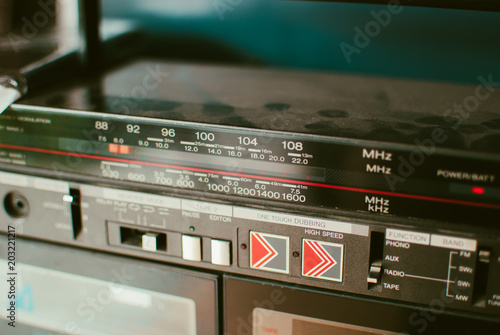 Retro dusty boombox (tape recorder) on a shelf in a garage