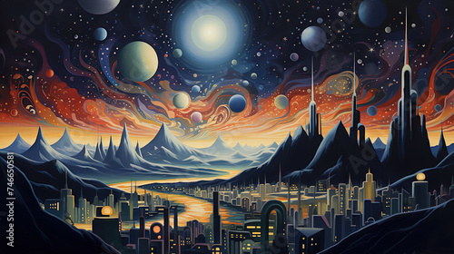 Retro futuristic city in the old school sci-fi art scene. Retro space landscape with city.