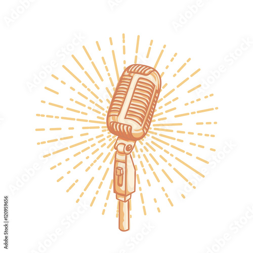 Retro golden microphone. Hand drawn retro illustration with sunburst, isolated on white. Suitable for banner, ad, t-shirt design. Vintage design element
