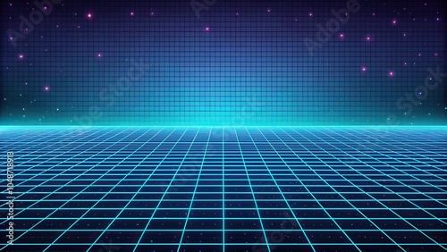 retro landscape illustration with blue grid pattern background