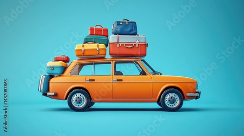Retro orange car loaded with colorful suitcases, ready for a journey. The car is parked against a vibrant blue background, showcasing a classic aesthetic
