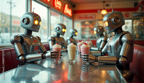 Retro robots enjoying milkshakes together in a classic 1950s style diner. AI generated