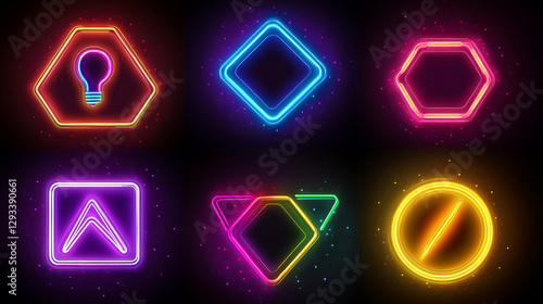 Retro show signs set isolated on transparent background. Vector realistic illustration of red square, round, rhombus frames decorated with light bulbs illumination, blank banner for game ui design