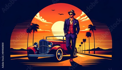 Retro Sunset with Classic Car and Fashion Model, Vintage Beach Scene with Elegant Man and Old-fashioned Automobile, Illustrations for card, poster, banner, flyer, brochure, background or T-shirt.