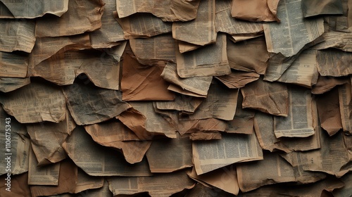 Retro textured wall covered with overlapping aged newspaper pages with printed text, creating a vintage and nostalgic appearance