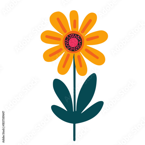 Retro-inspired illustration of a vibrant orange and yellow daisy with a dark teal stem and leaves, set against a pure white background, evoking a cheerful and natural aesthetic