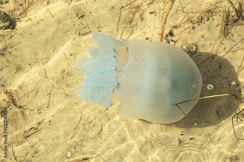 Rhizostoma pulmo barrel jellyfish in sea against bottom.