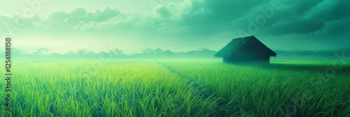 Rice fields with a small hut surrounded by vibrant green landscape