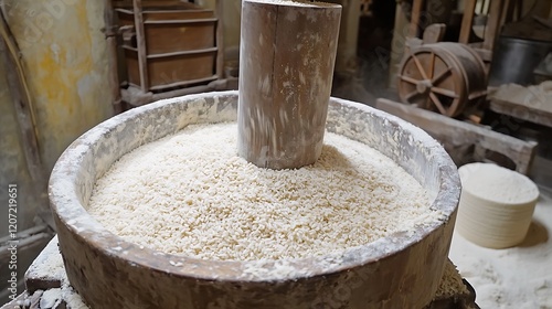 Rice milling in old mill; grain processing; wooden mortar and pestle; historical setting; food production