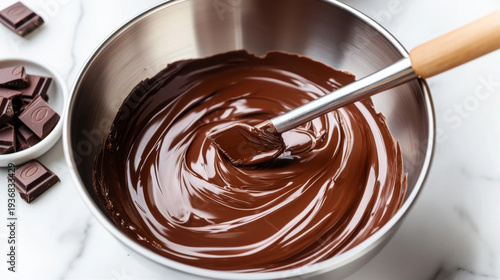 Rich glossy melted dark chocolate being stirred in a stainless steel mixing bowl with a spatula surrounded by chocolate squares on a white marble surface for baking recipes.
