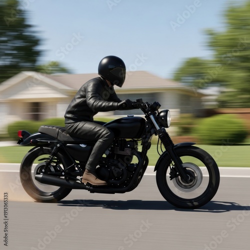 Rider in black on motorcycle zooms past suburban home on a sunny day