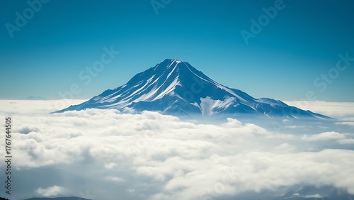 ridge. Snow-capped mountain peak above clouds under a clear blue sky. travel magazines, destination branding, wall prints, designed for outdoor magazines and nature guides, used by project managers.