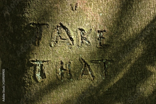 Rindenschnitzerei "Take that"
