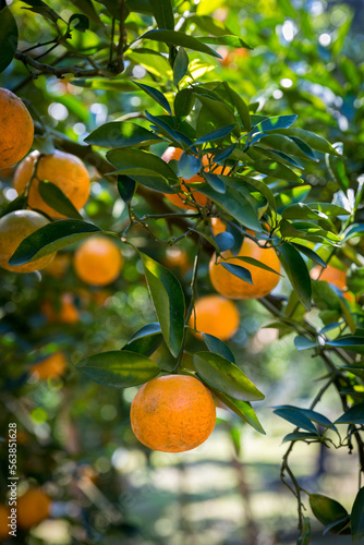 Ripe and fresh oranges hanging on branch, orange orchard. Orange on tree. Orange garden.