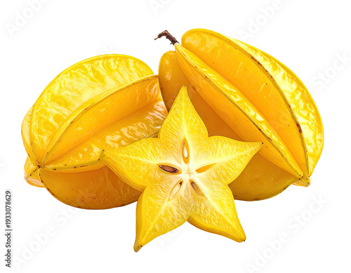 Ripe, bright yellow starfruit, one sliced to reveal internal star shape and seeds