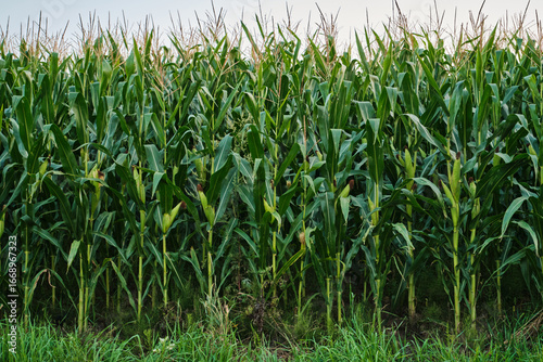 Ripe Corn Cobs on Stalks in Farm Field Harvest.