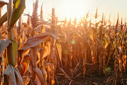 Ripe corn on the field in the rays of the setting sun