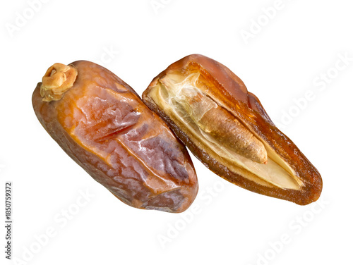 Ripe dried date palm fruit witth half in stack isolated with clipping path in png file format Concept of iftar food in Ramadan month for Muslims