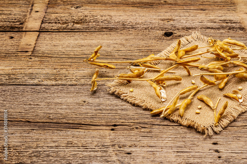 Ripe dry soybeans in pods. Cultivated organic agricultural crop, traditional healthy ingredient in oriental culture. Vintage sackcloth, wooden boards background