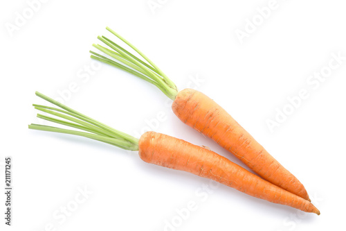 Ripe fresh carrots on white background