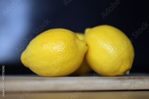 Ripe lemons on a wooden cutting board. Healthy, delicious and fresh ingredient for cooking, baking and drinks. Healthy eating and lifestyle. Photographed in Sweden. Black background. Color closeup.