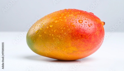 Ripe mango with water droplets on a clean white background, a healthy and delicious tropical fruit