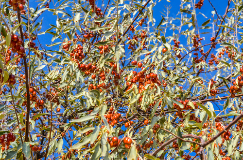 ripe oleaster (russian olive) fruits on the tree (Elaeagnus angustifolia) in Karankul (Tashkent region, Uzbekistan)