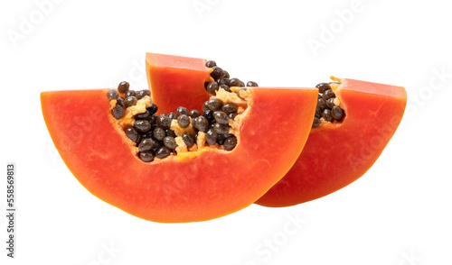 Ripe papaya fruit cut in half on white background