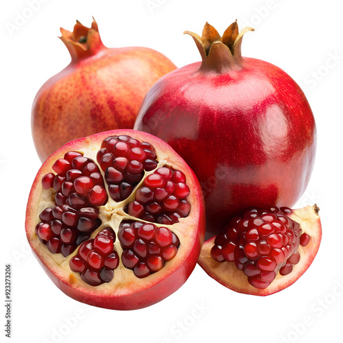 Ripe pomegranate fruits and one cut isolated on white background. Ai generated
