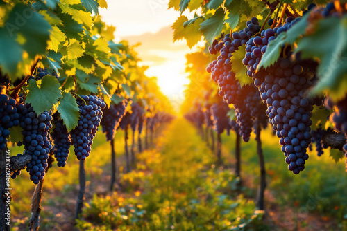 Ripe purple grapes hanging on vineyard vines with lush green leaves, realistic style, warm sunset background, concept of food harvest and nature. Ai generative