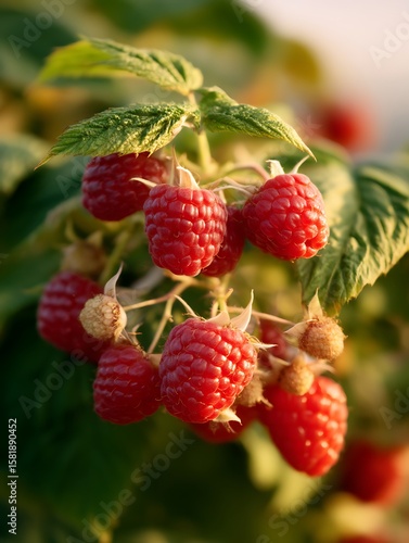Ripe Raspberries on the Bush at Sunset. A close up image of fresh raspberries growing on a branch.