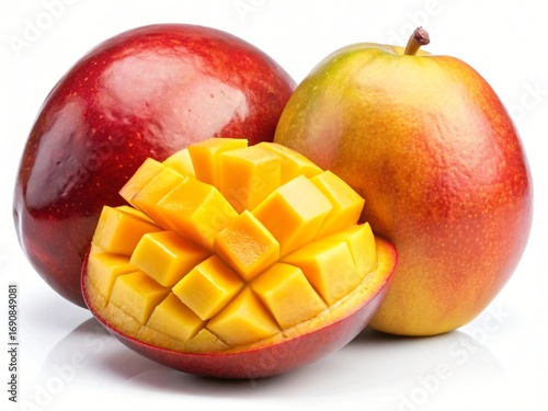 Ripe red mangoes one sliced to show diced yellow flesh on white background