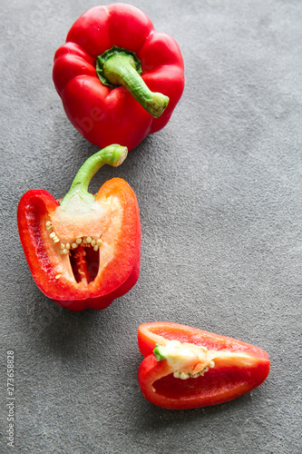 Ripe red peppers on grey background
