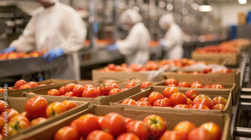 Ripe tomatoes packed cardboard boxes processing facility, captures red tomatoes of boxes