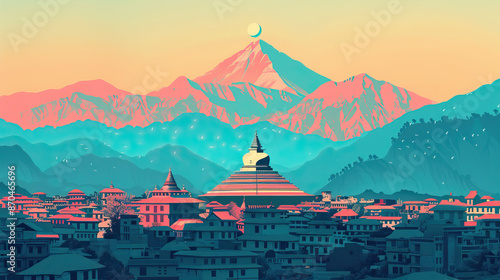 Risograph riso print travel poster, card, wallpaper banner illustration, modern, clear, simple of Boudhanath Stupa, Kathmandu, Nepal. Artistic, landmark printing, stencil backdrop background