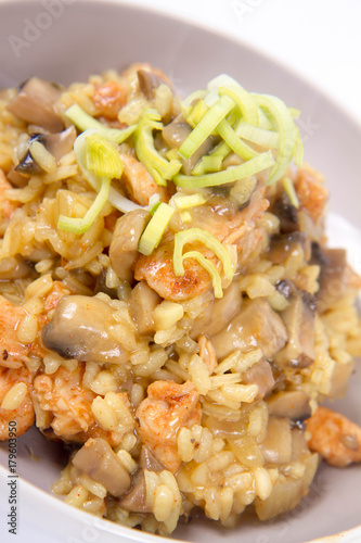 Risotto with mushrooms and chicken decorated with leek on a white background